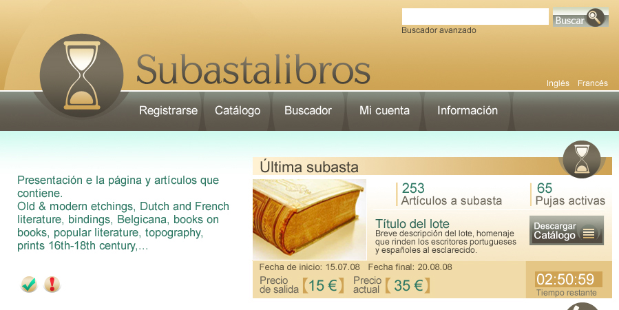 Aplicación para la puja de artículos en tiempo real. Portal de subastas de lotes de artículos, con una descripción detallada de fecha y precio de salida y siempre el actual, con un reloj cronómetro que indica el tiempo restante. Visible el número de pujas y de artículos activos en cada momento.